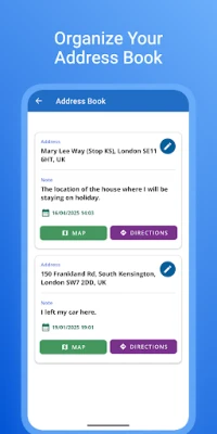 This app lets you quickly view both your current and desired locations' full addresses and save them for future use. It’s an easy way to manage and organize your addresses.